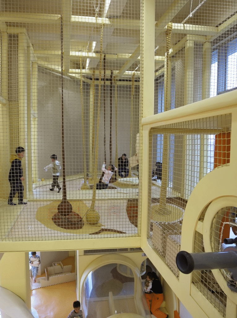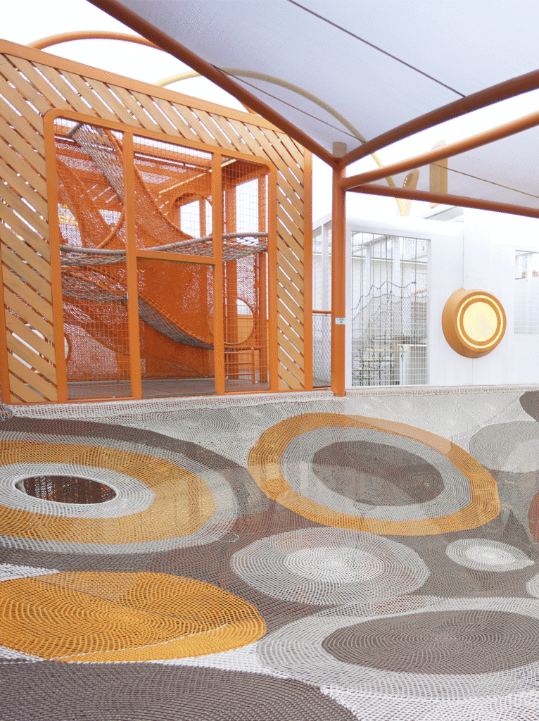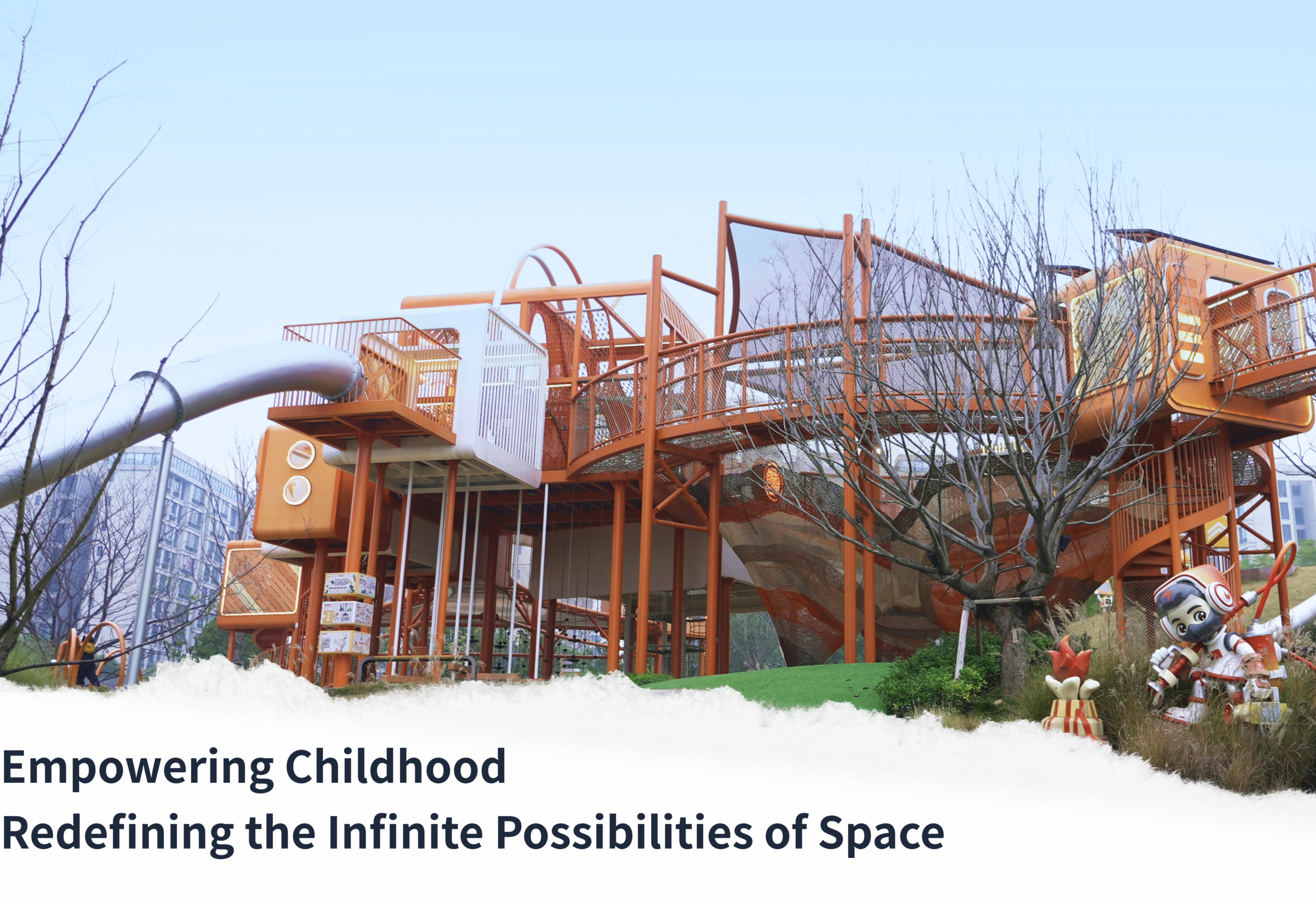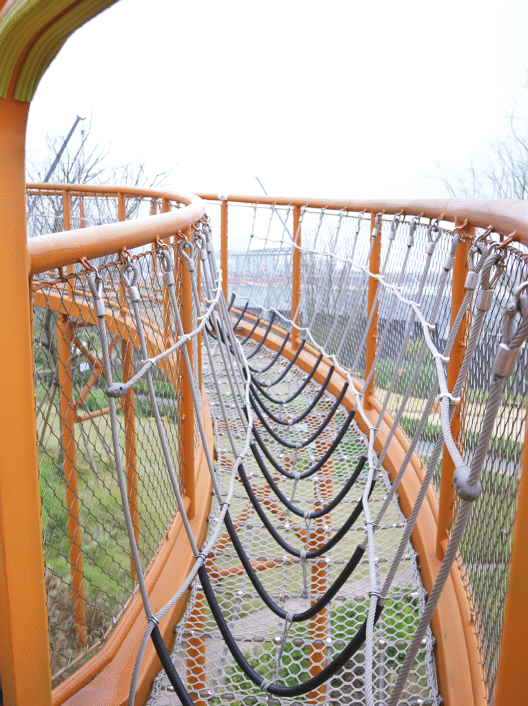 For expansive outdoor lawns, we needed a visual symbol capable of breaking the spatial monotony. By fully utilizing the natural slope and elevation changes, we designed a multi-layered, multi-dimensional play landscape. The orange rope net carves a tension-filled arc between the earth and the sky.