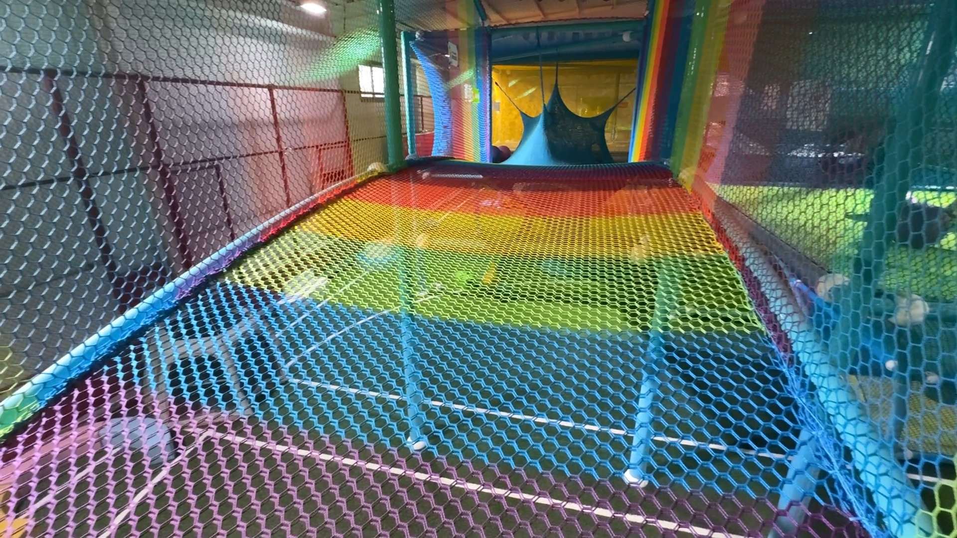 This is an elastic walkway bridge woven from rainbow-colored rope nets, designed specifically to connect two different play areas. It is not only a safe and fun passage but also a visual rainbow that brightens up the playground.